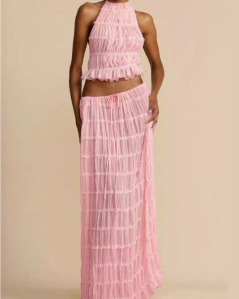 Opgrader din sommergarderobe med Jeanette‑sættet – et todelt look i let og luftig kvalitet, der kombinerer en flatterende haltertop med en matchende nederdel. Perfekt til varme dage, uden at gå på kompromis med stil.