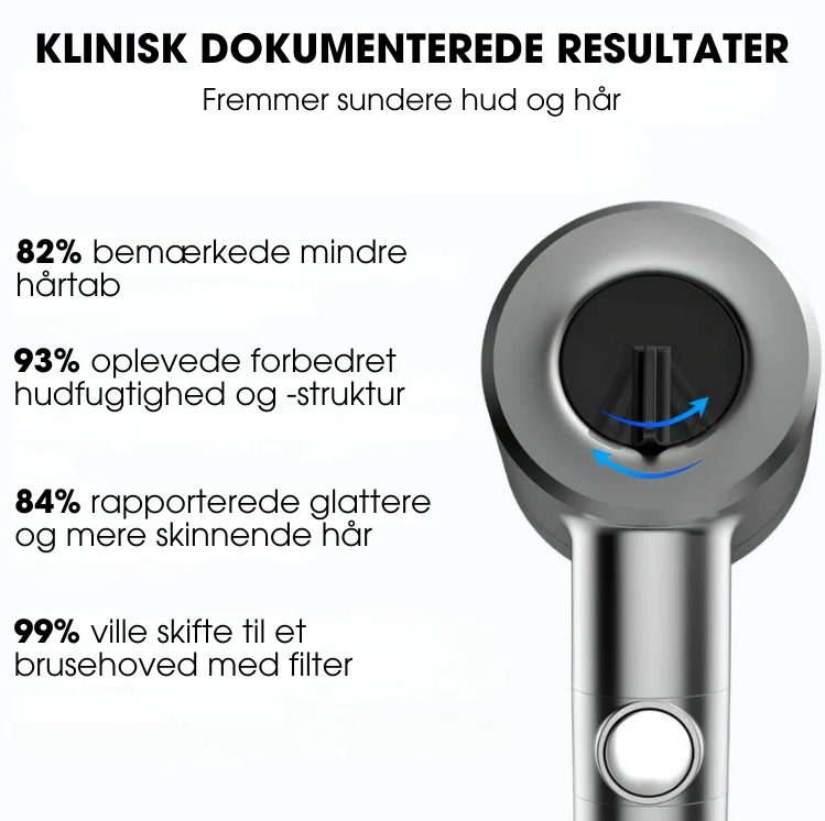 Med et integreret filter bliver dit vand fri for urenheder, klor og kalk. Dette beskytter din hud og dit hår mod skadelige kemikalier, der ofte fører til tørhed, irritation eller hudproblemer.