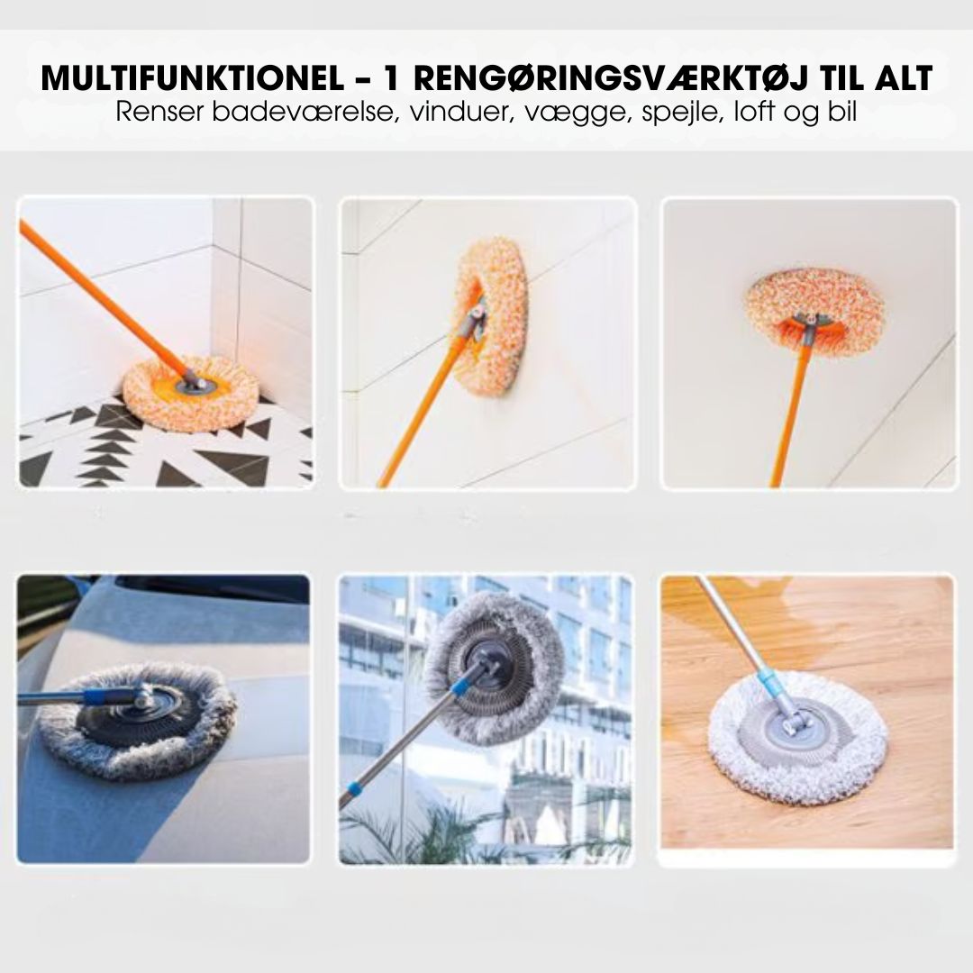 Denne moppe er multifunktionel: brug den til gulve, lofter, vinduer, badeværelser, spejle og selv til bilen. Det 180° drejelige hoved glider let rundt om møbler og ind i selv besværlige hjørner.