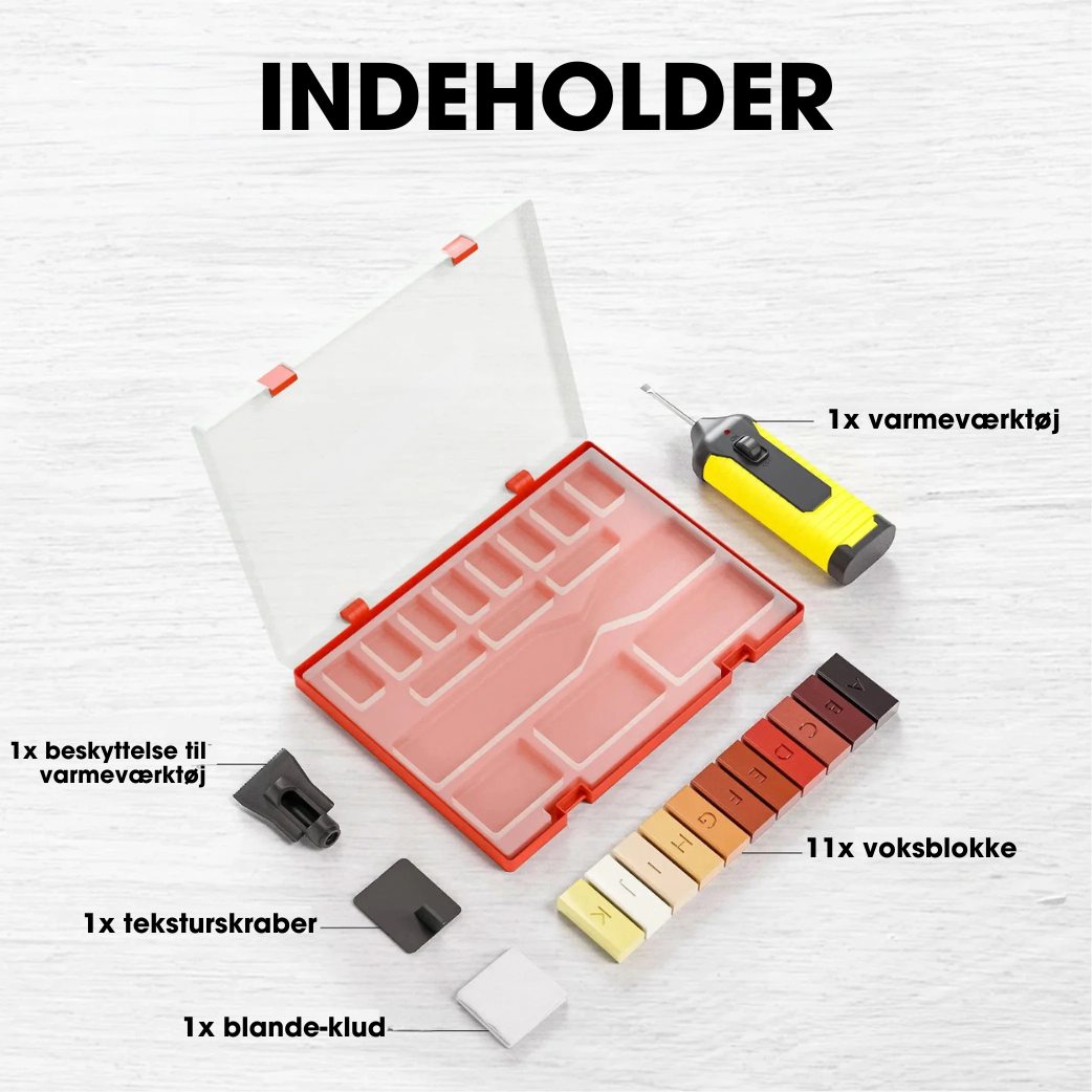 WoodFix™ leveres med 11 farvede voksblokke, der passer til alle træsorter, samt en varmepen for nem og præcis påføring. Materialerne er af høj kvalitet og sikrer langvarige resultater, mens det lette og brugervenlige design gør det nemt for alle at anvende.
